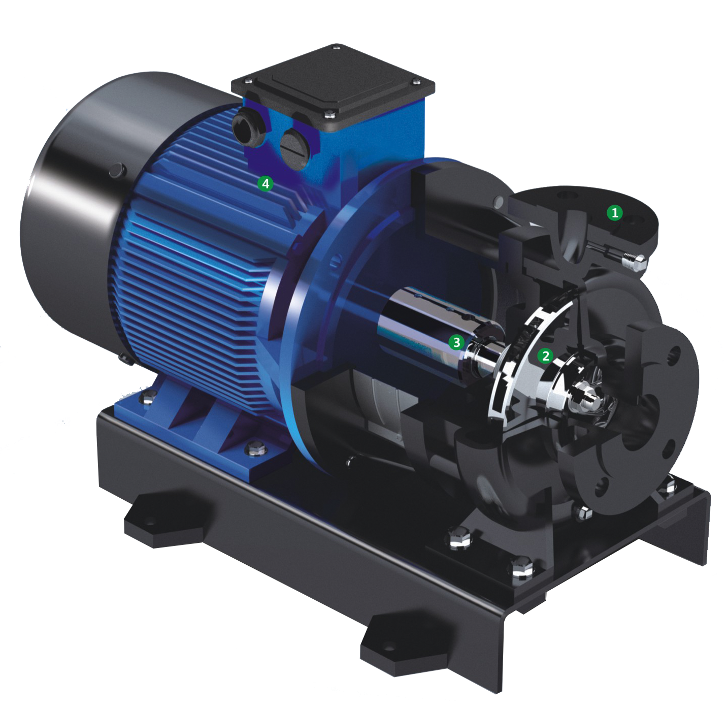 Насосные агрегаты состоят из двух основных частей (проточная часть и электродвигатель) и монтируются на общем рамном основании. Напорный патрубок насосной части – радиальный, всасывающий – осевой. Благодаря технологичной конструкции, демонтаж подшипникового узла с валом, узлом уплотнений и рабочим колесом может осуществляться без отсоединения корпуса насоса от трубопроводной системы.