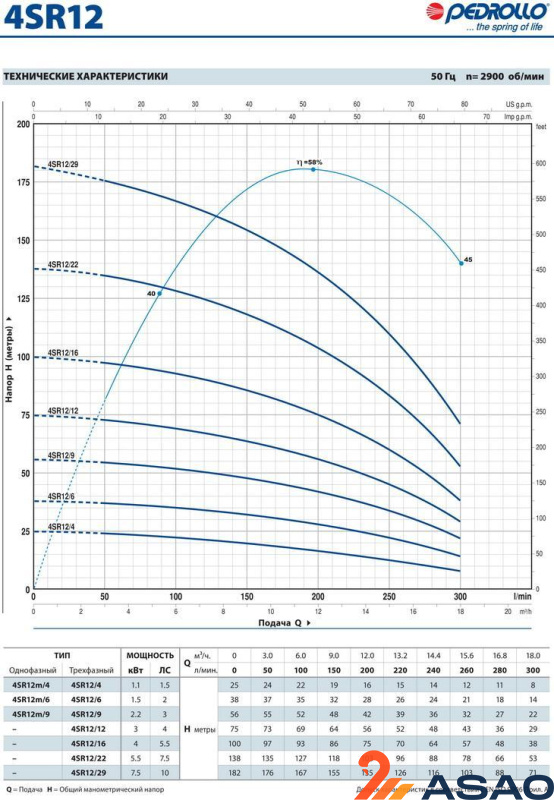 Серия 4SR12 включает в себя МНОГОСТУПЕНЧАТЫЕ ЭЛЕКТРОНАСОСЫ ЦЕНТРОБЕЖНОГО ТИПА, предназначенные для постоянного функционирования в погруженном состоянии. Двигатель подключается к насосу через суппорт, параметры которого соответствуют нормативам NEMA. Принцип функционирования аналогичен принципу функционирования многоступенчатых центробежных насосов. Рабочие колеса, установленные на одном и том же ведущем валу, вращаются внутри лопаточных диффузоров, которые обеспечивают движение жидкости на выходе каждого рабочего колеса по направлению к всасывающему патрубку следующего рабочего колеса. После прохождения через все рабочие колеса, установленные последовательно, жидкость покидает насос через нагнетательный патрубок. Каждое рабочее колесо с соответствующим лопаточным диффузором создают ступень нагнетания, которая, согласно принципу функционирования центробежных насосов, обеспечивает для жидкости перепад давления, который суммируется с перепадами, создаваемыми другими последовательными ступенями.